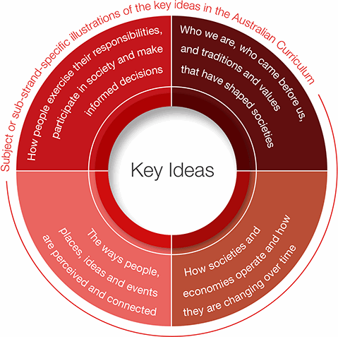 Through their learning in each subject or sub-strand, students develop knowledge and understanding relating to broader enduring ideas that underpin the Humanities and Social Sciences in the Australian Curriculum, which are represented in varying ways across the subjects. The key ideas are outlined below:
