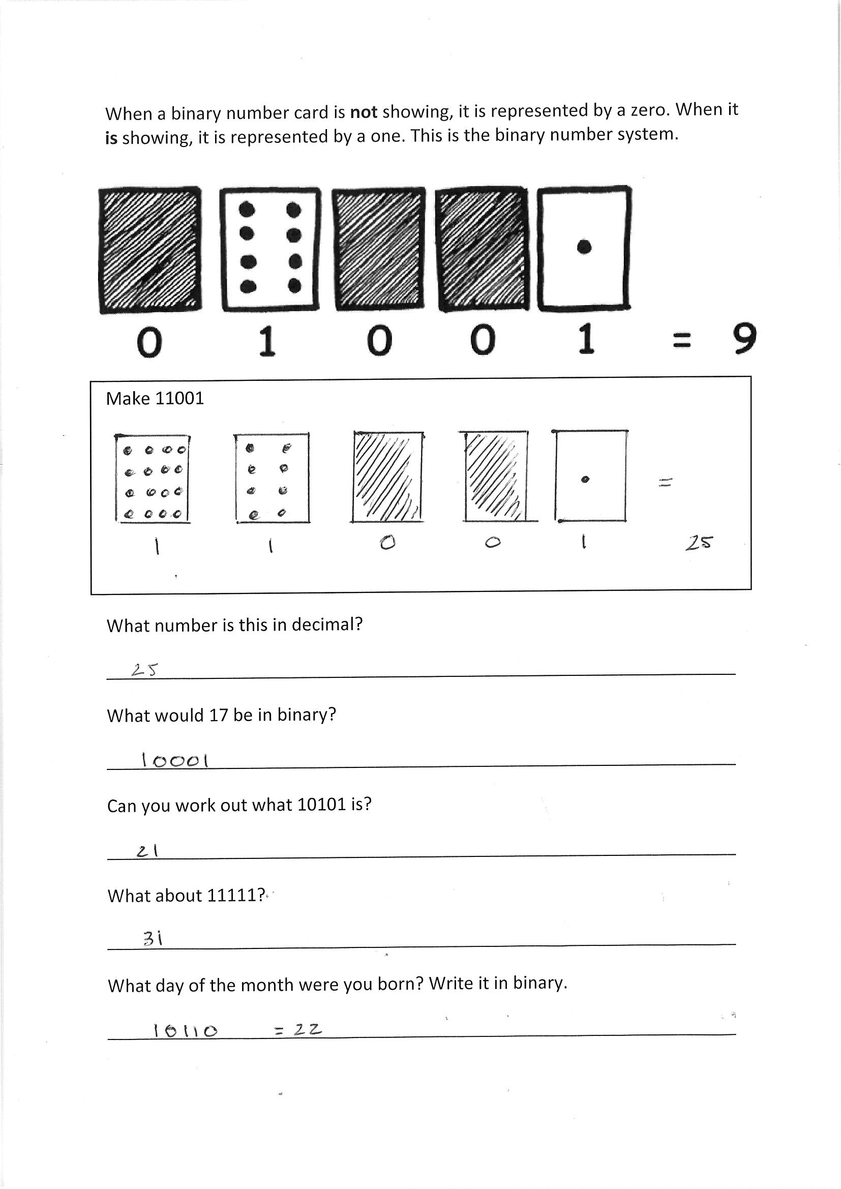 Students were introduced to whole numbers using a CS Unplugged video and unplugged group activities. Students completed a worksheet to assess their understanding of binary numbers.
